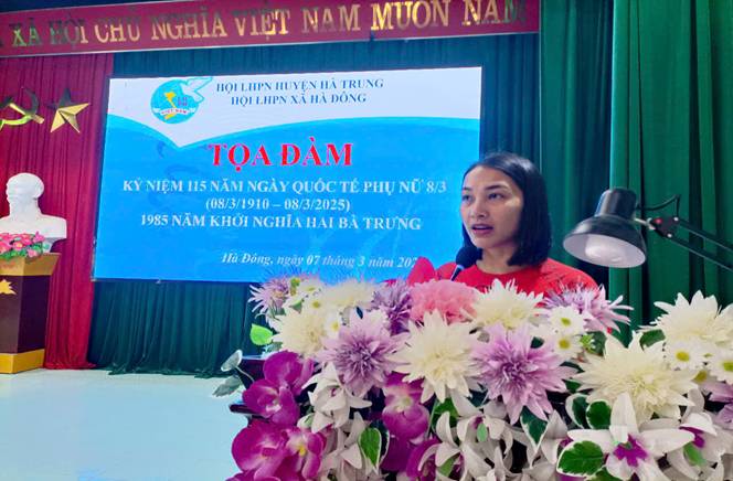Tại buổi tọa đàm, đồng chí Phạm Thị Thúy Hằng Chủ tịch Hội LHPN xã Hà Đông đã ôn lại truyền thống ý nghĩa 115 năm Ngày Quốc tế phụ nữ 8/3 và 1985 năm Khởi nghĩa Hai Bà Trưng, truyền thống quê hương xã Hà Đông vai trò của phụ nữ trong gia đình, cộng đồng và xã hội; chủ đề của ngày 8/3 năm 2025 là Chuyển đổi số cho tất cả mọi người: Sáng tạo và công nghệ cho bình đẳng giới