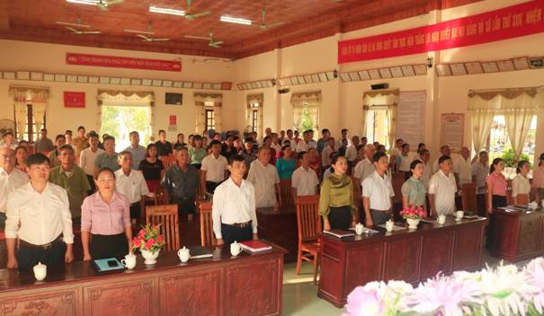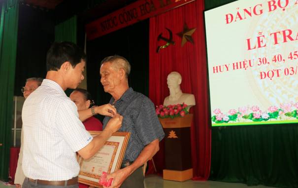 Đồng chí Hoàng Văn Toàn, UVBTV Huyện ủy, Trưởng Công an huyện và Đồng chí Phạm Văn Vĩnh, Bí thư Đảng uỷ xã đã chúc mừng và trao Huy hiệu Đảng cho các đảng viên.